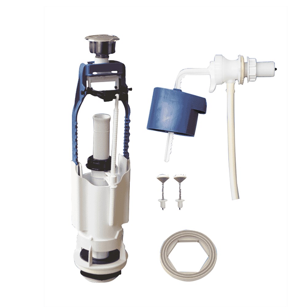 Комплекты арматуры с кнопочным одноуровневым/двухуровневым клапаном выпуска предназначены для использования с керамическими бачками, отверстие в крышке которых имеет примерный диаметр 40 мм. Комплекты с двухуровневым клапаном обеспечивают экономное расходование воды.