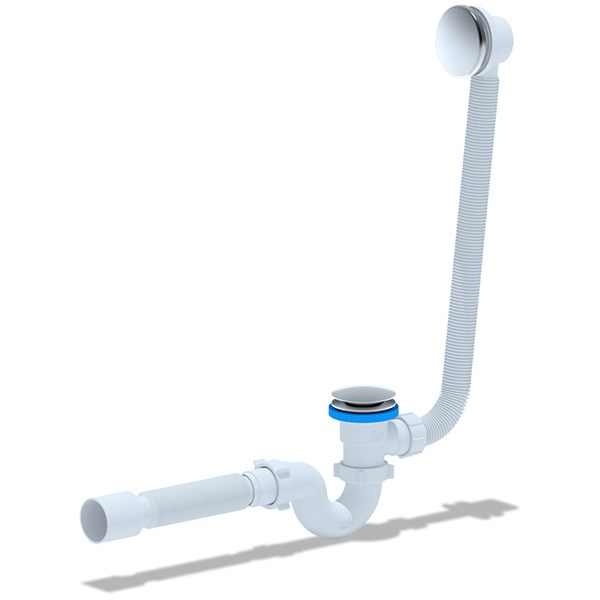 Сифон комплектуется металлическим выпуском "клик-клак" с сеткой. Механизм "клик-клак" приводится в действие путем нажатия на выпуск, при этом открывается или блокируется выпуск воды в канализацию. Самый простой сифон для ванны, имеющий всего один параметр регулировки. Изменение направления слива воды возможно путем разворота в месте присоединения к выпуску. Благодаря своей форме прямоточный сифон имеет высокую скорость слива сточной воды, а так же самый простой способ прочистки без демонтажа, при этом выполняя главную функцию - формирование гидрозатвора для отсечения неприятных запахов из канализации. В процессе эксплуатации сетка в сливном отверстии легко прочищается от волос и крупных частиц.