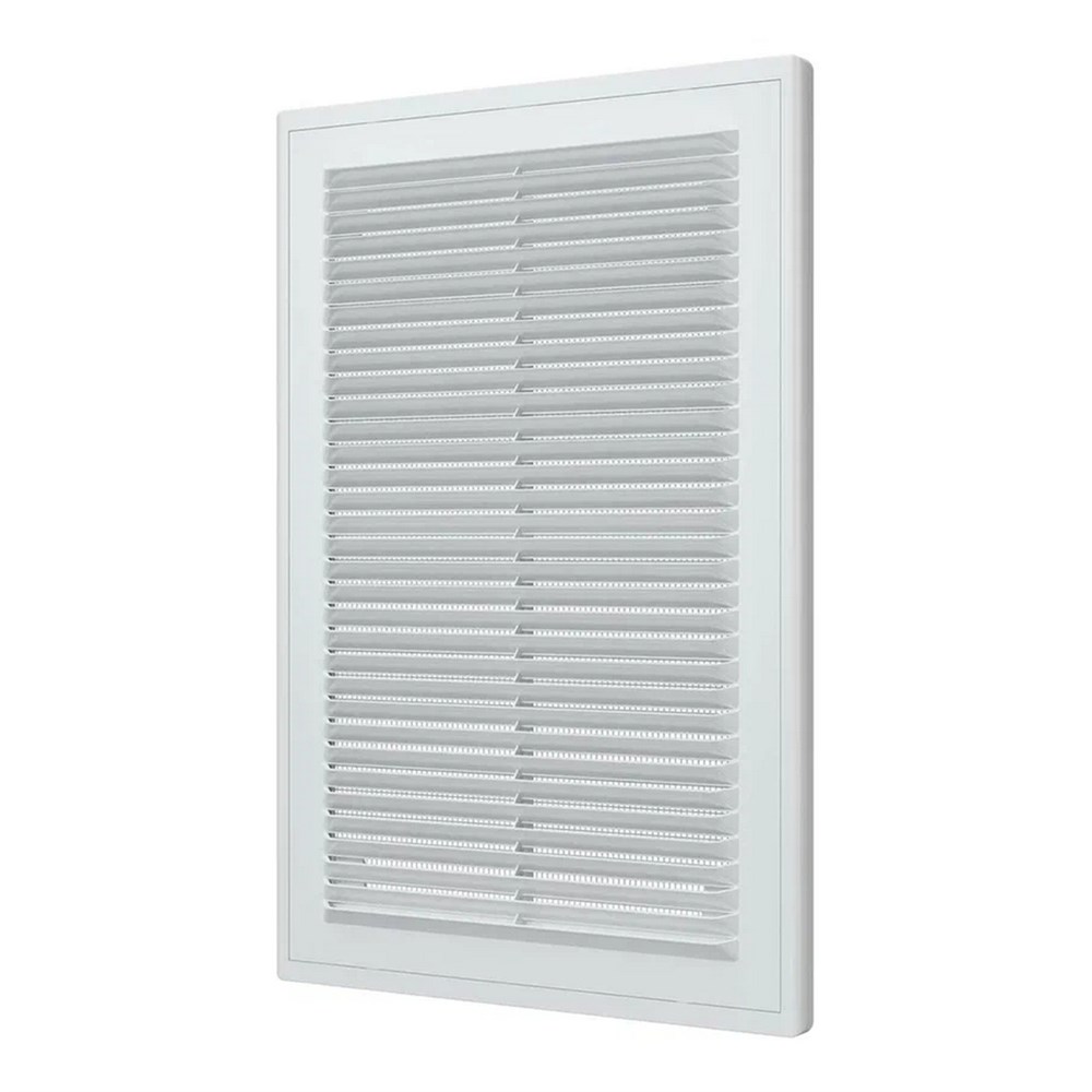 Вентиляционная решетка имеет наклонные жалюзи и оснащена защитной сеткой от насекомых.