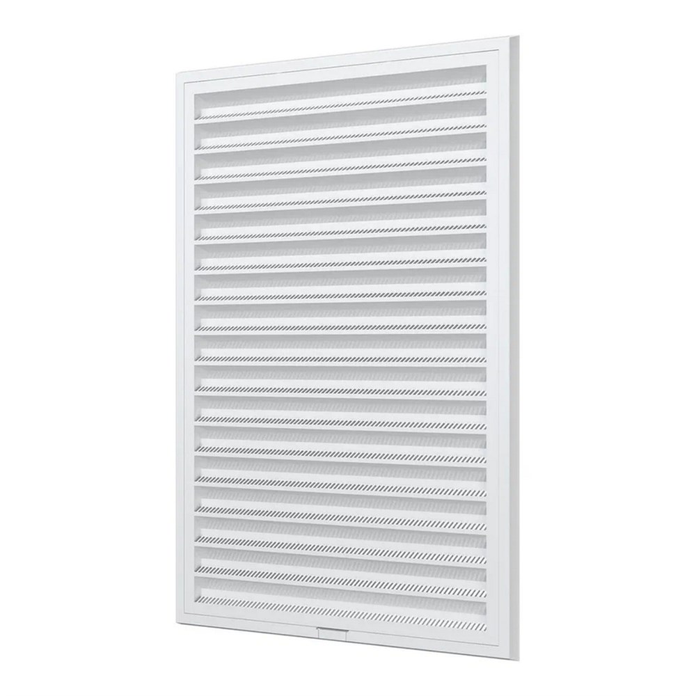 Вентиляционная решетка имеет наклонные жалюзи и оснащена защитной сеткой от насекомых.