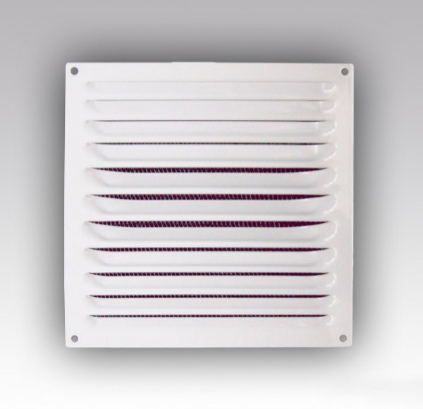 Вентиляционная решетка имеет наклонные жалюзи и оснащена защитной сеткой от насекомых.