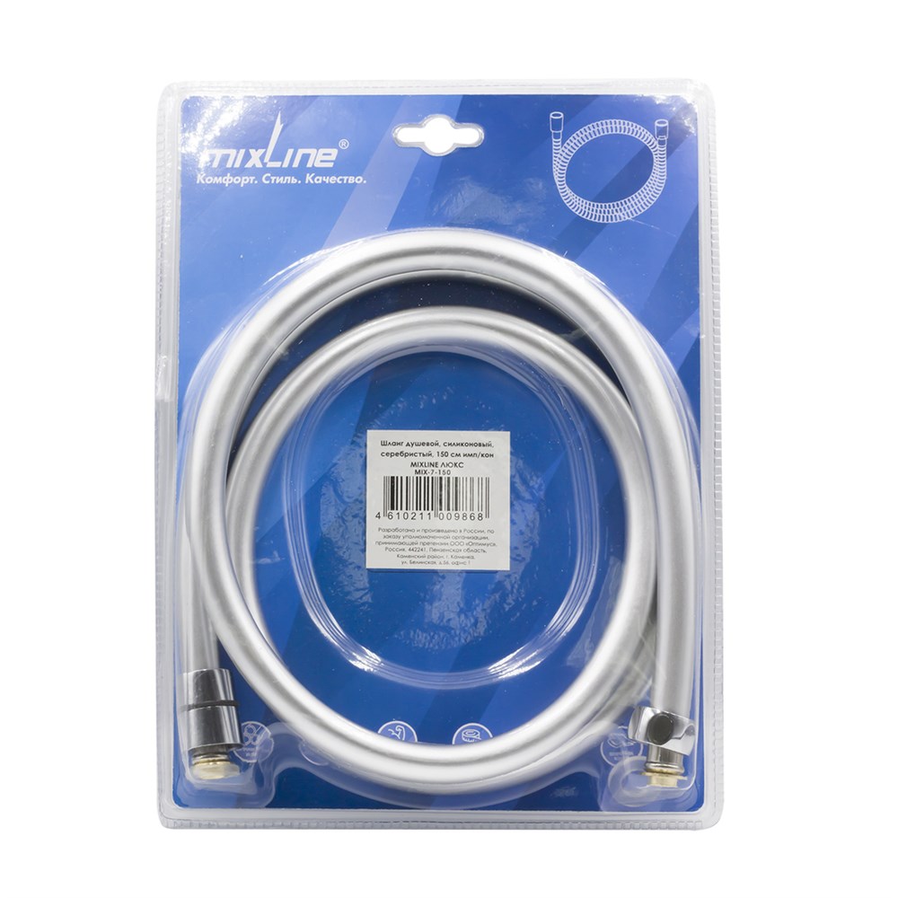 Шланг душевой 150 см имп/кон, силиконовый, серебристый MIXLINE MIX-7-150 ЛЮКС (блистер)