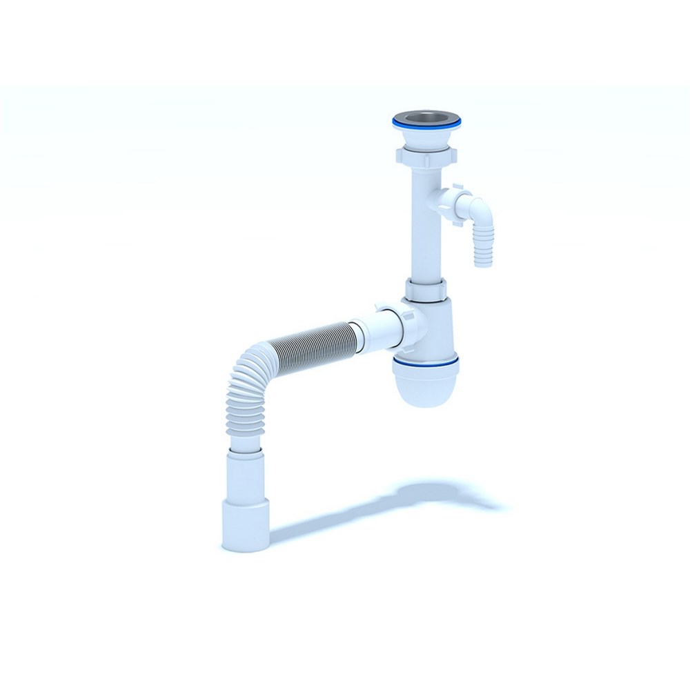 Сифон для кухонной мойки с диаметром сливного отверстия 50мм, бутылочного типа, с разборным выпуском и нержавеющей решеткой, с отводом для подключения бытовой техники. Для подключения к канализации комплектуется гибкой трубой 40*40/50мм.