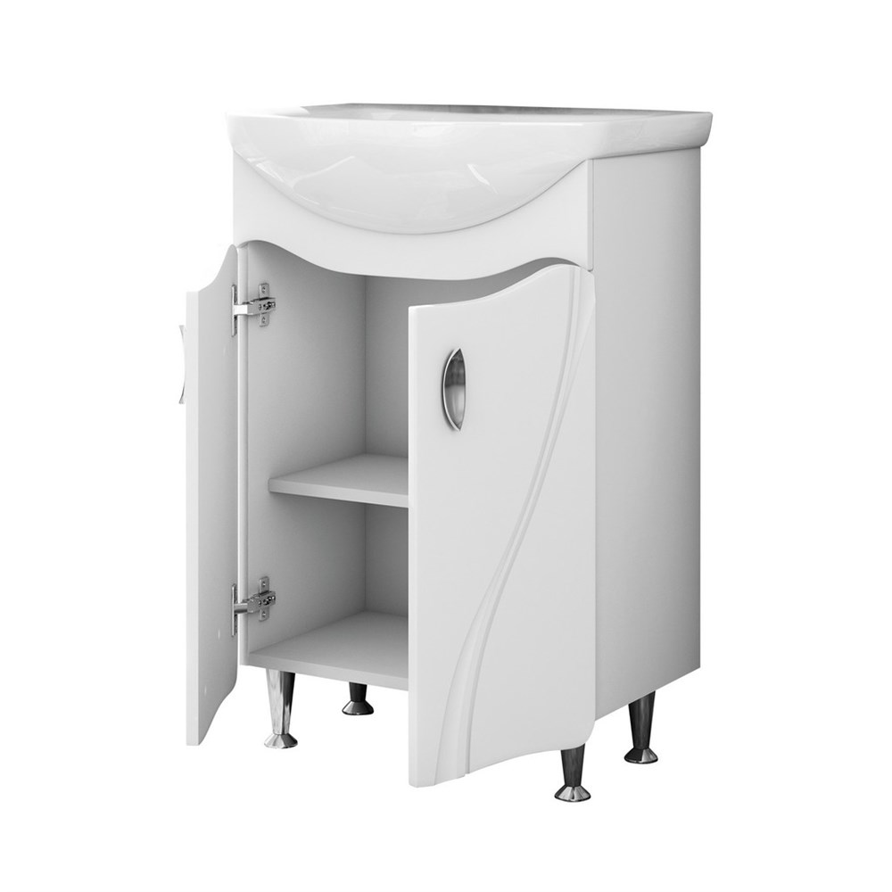 Комплект мебели предназначен для небольших ванных комнат. Изящно вьющиеся линии, украшающие фасады мебели, придадут ванной легкости, а тщательно продуманная конструкция и организация внутреннего пространства позволяет навести порядок даже в небольшой ваной комнате.
