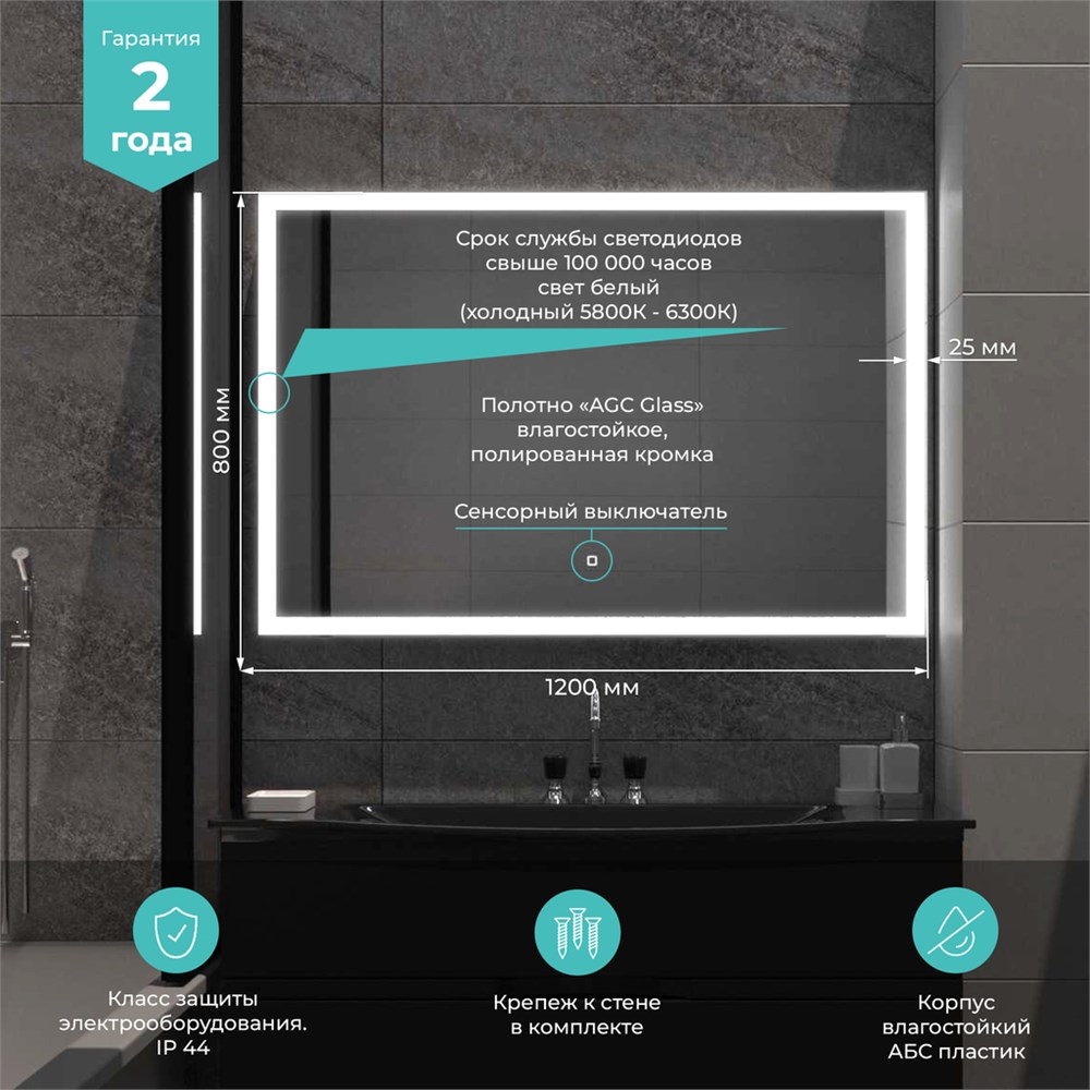 Современная светодиодная подсветка с влагозащитой IP20-IP33 обеспечивает не только эффектное освещение, но и надёжную работу в условиях повышенной влажности. Для изготовления продукции мы используем материалы высокого качества - серебряное влагостойкое зеркальное полотно от AEK (AGC Glass Russia - российская ветвь AGC Glass Europe).